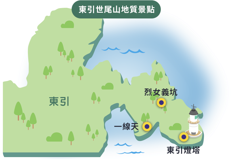 東引地勢高聳陡峭,是馬祖唯一沒有沙灘的島嶼。它的海蝕地形非常豐富,岩石長期受海浪拍打與雨水等侵蝕作用,海岸地區可看到岬角、顯礁、陡峭的海蝕崖、海蝕溝、海蝕洞,還有與海岸相互平行的節理等地形。